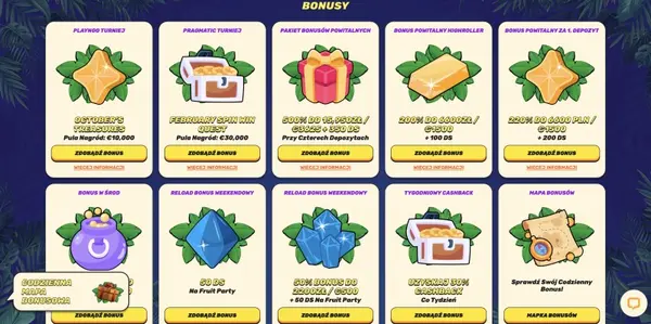 | Weekend Reload (PLN) | 50% do 2200 PLN + 50 FS (Fruit Party) | Sprawdź czas wygaśnięcia w karcie promocji |