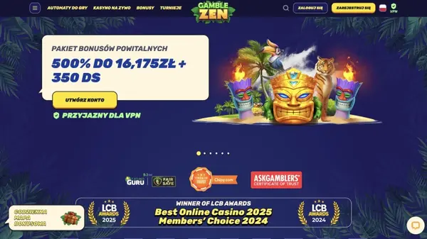 Witamy w GambleZen Casino, uruchomionym w 2023 roku i zarządzanym przez Altacore N.V. Skupiamy się na prostym doświadczeniu dla graczy w Polsce: przejrzyste warunki bonusów, duża biblioteka gier oraz metody płatności dobrze działające z PLN. W kasyno GambleZen Polska możesz wybierać spośród slotów, stołów z krupierem na żywo, jackpotów, gier crash, wideopokera oraz klasycznych gier stołowych, a poszczególne tytuły pokazują wartości RTP, np. od 95% do 97%. Wspieramy język polski, a jeśli wolisz, możesz też korzystać z EUR lub krypto, obok opcji przyjaznych dla PLN, takich jak BLIK.